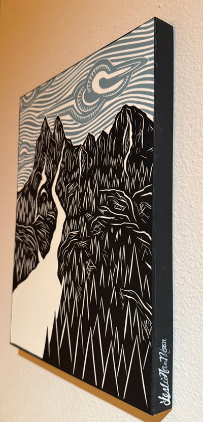 Leslie Nan Moon is a Seattle-area printmaking artist known for her vivid linocut works that celebrate Pacific Northwest themes and local landmarks. She is recognized for her distinctive jigsaw puzzle linocut technique, where she carves, inks, and reassembles linoleum blocks to create detailed multi-colored prints. Leslie’s artistic style is deeply narrative, often blending real and imagined elements inspired by the region’s natural beauty and cityscapes. Her art is currently featured on 19 of the Seattle Monorail columns along 5th Avenue.