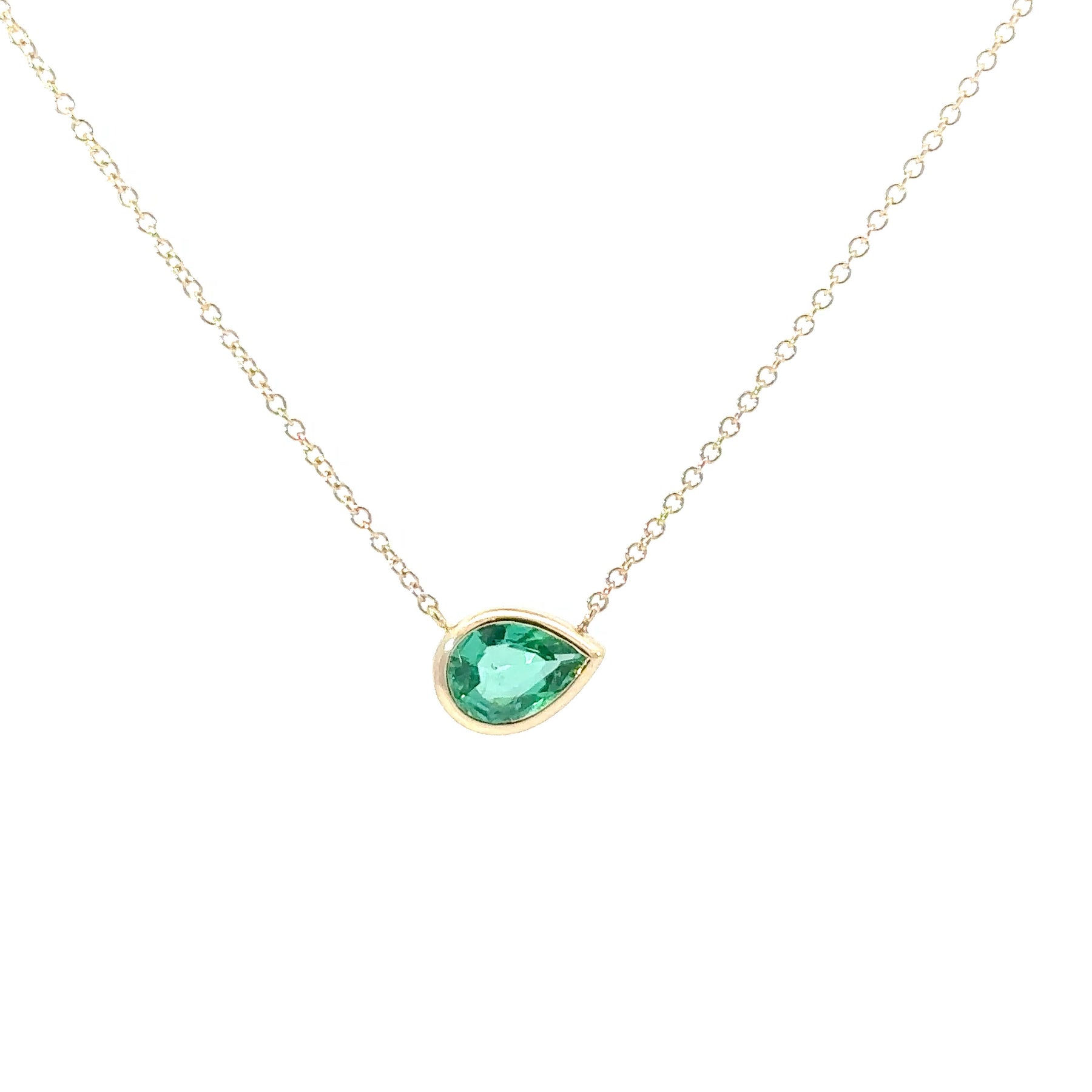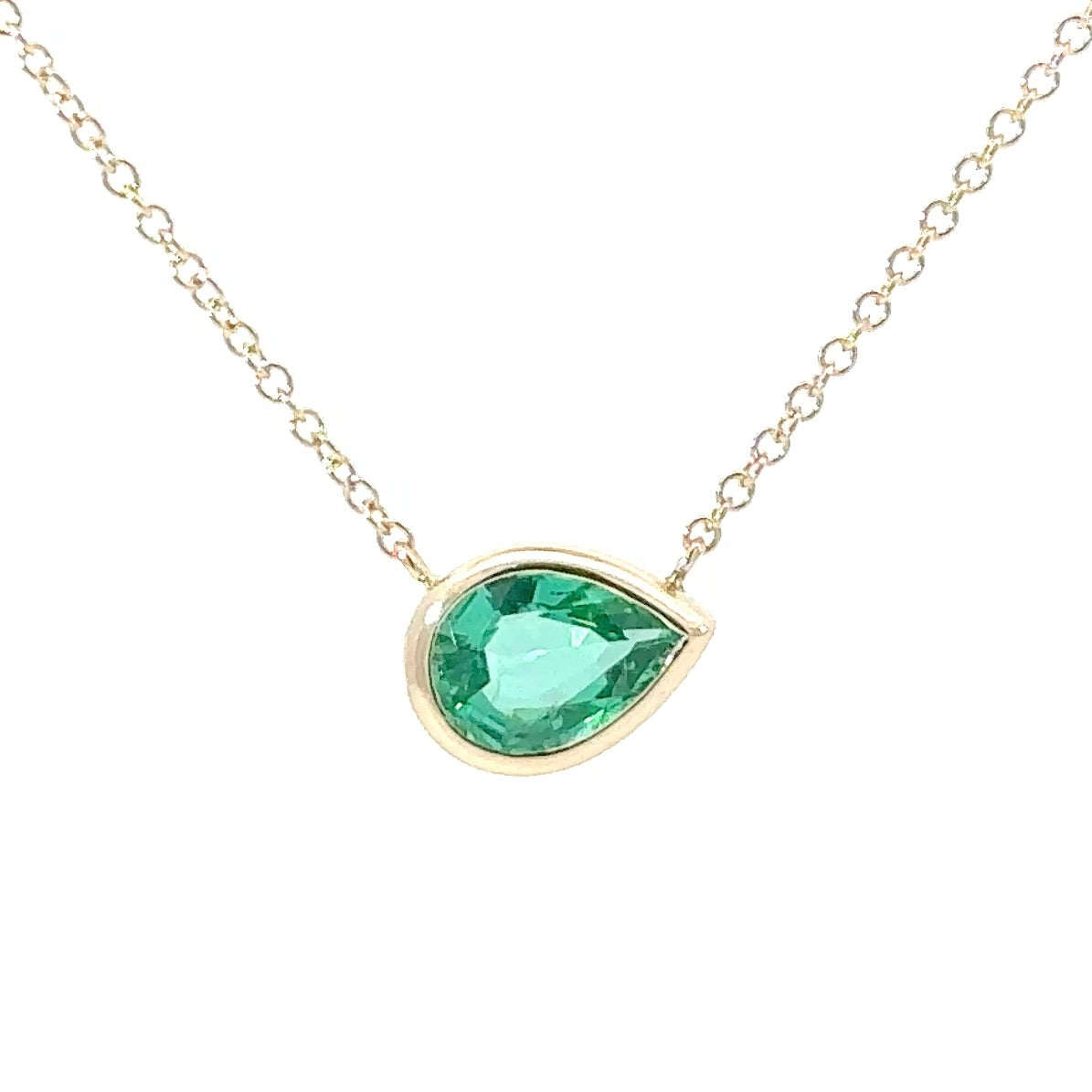 This necklace features an emerald from our Brazilian Mine Adventure! It is a pear shape emerald in a 14K Yellow Gold bezel, set east/west style.