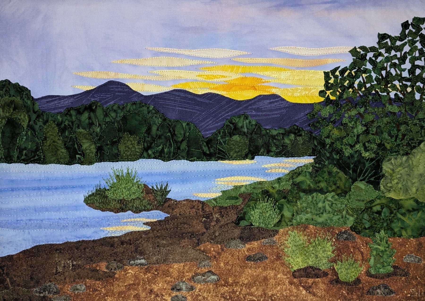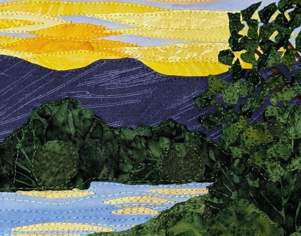 The Pacific Northwest offers endless inspiration for my art with its majestic mountains, towering evergreens, crashing waves, roaring rivers and beautiful wildlife. My husband and I enjoy capturing this beauty with our cameras as we walk around our local parks and gardens or go on scenic drives. I love the challenge of turning a photo into a quilt using a variety of techniques including collage, applique, thread painting and free motion quilting. While some art quilters embellish their work with paint, I prefer to “paint” my quilts, using only fabric and thread, and the occasional addition of lace, cheesecloth or even cotton balls.