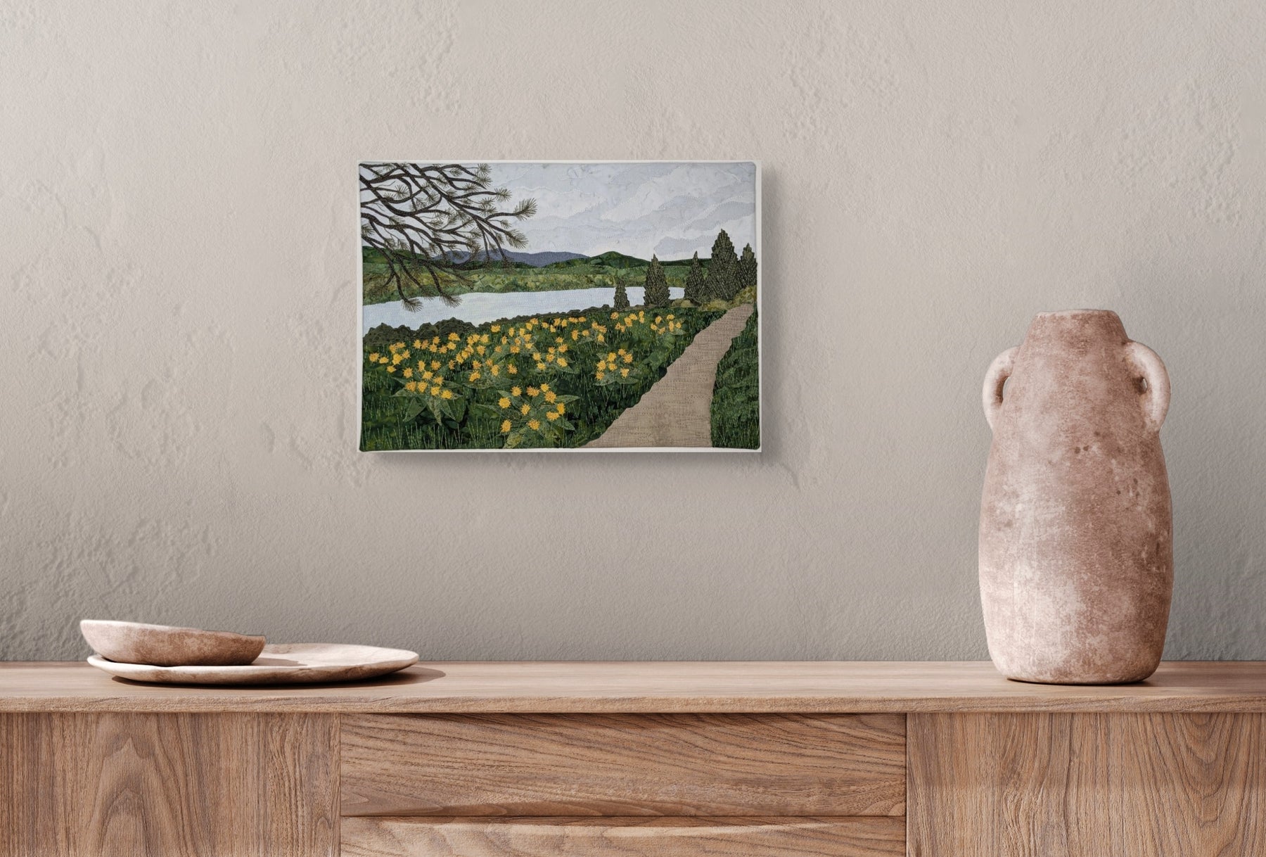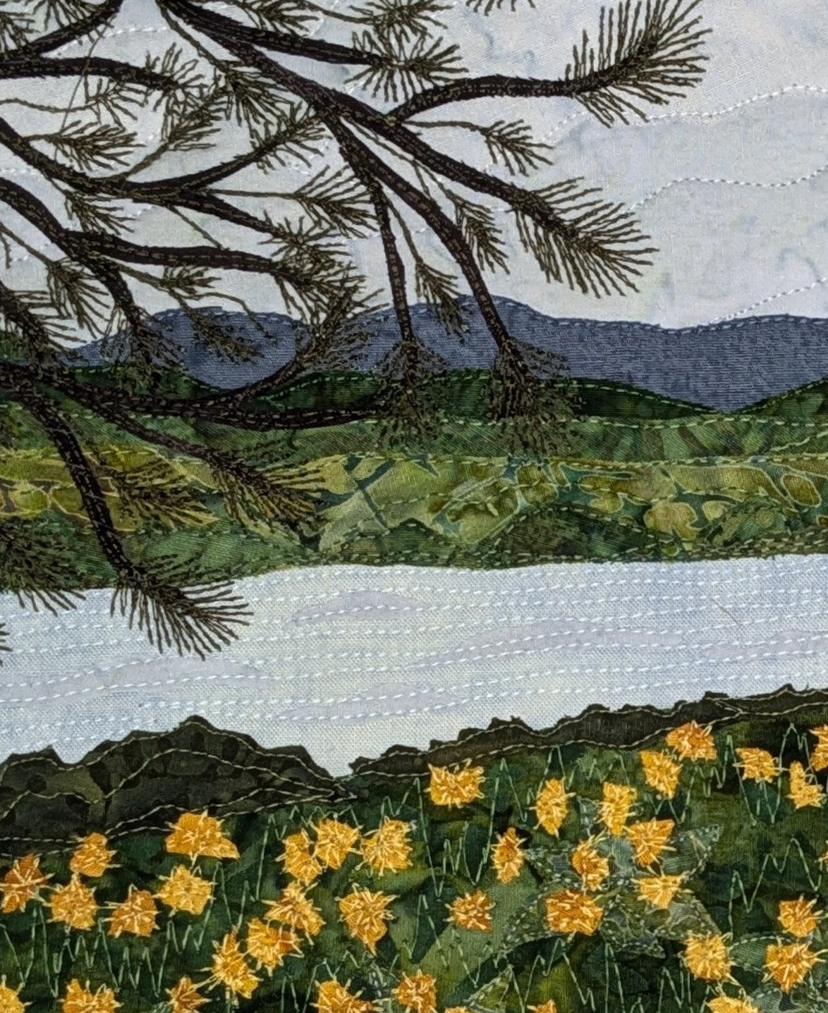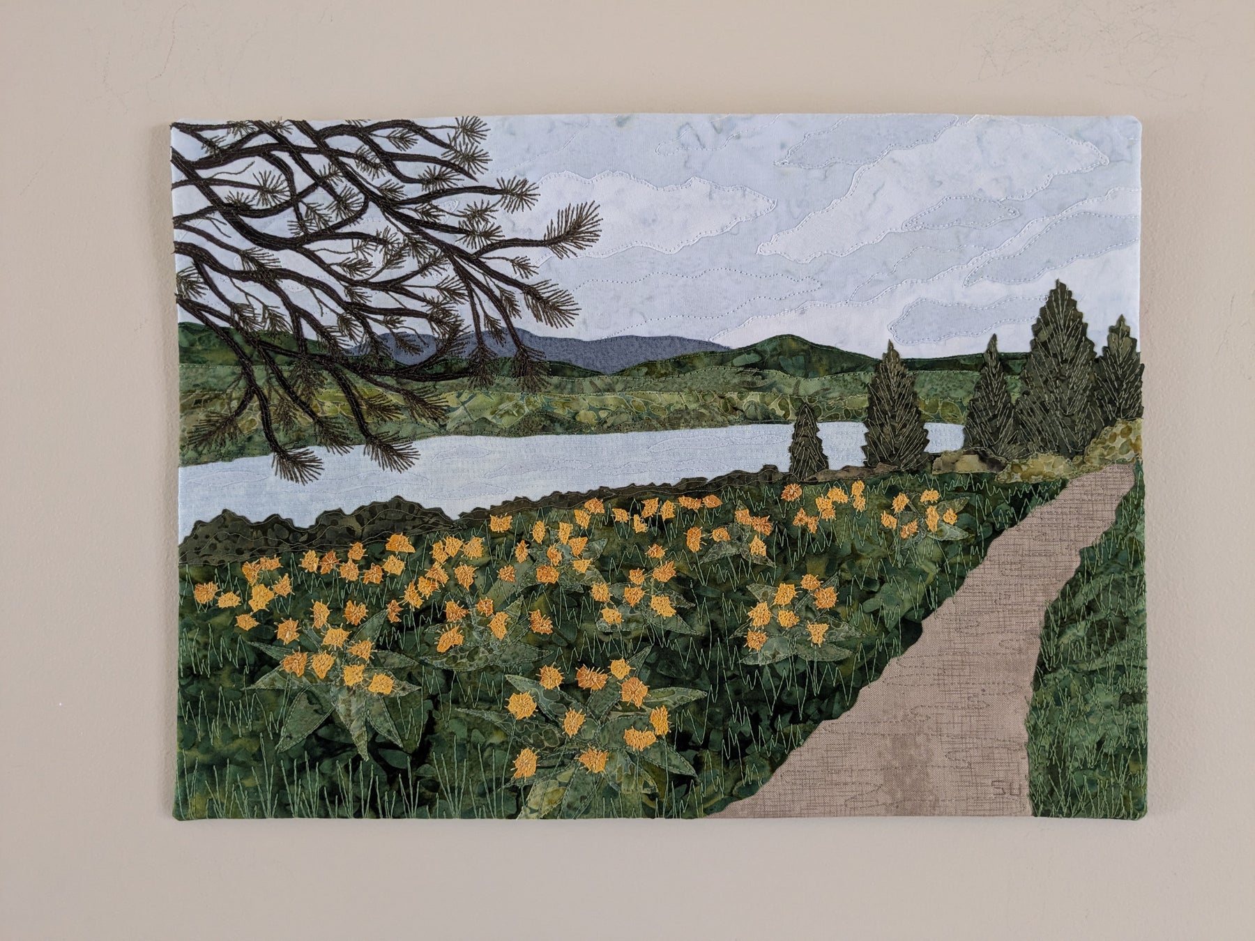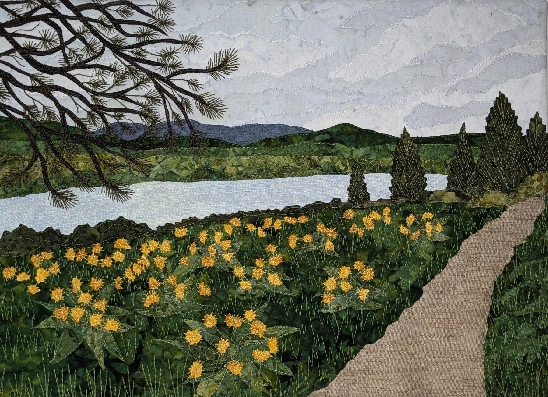 The Pacific Northwest offers endless inspiration for my art with its majestic mountains, towering evergreens, crashing waves, roaring rivers and beautiful wildlife. My husband and I enjoy capturing this beauty with our cameras as we walk around our local parks and gardens or go on scenic drives. I love the challenge of turning a photo into a quilt using a variety of techniques including collage, applique, thread painting and free motion quilting. While some art quilters embellish their work with paint, I prefer to “paint” my quilts, using only fabric and thread, and the occasional addition of lace, cheesecloth or even cotton balls.