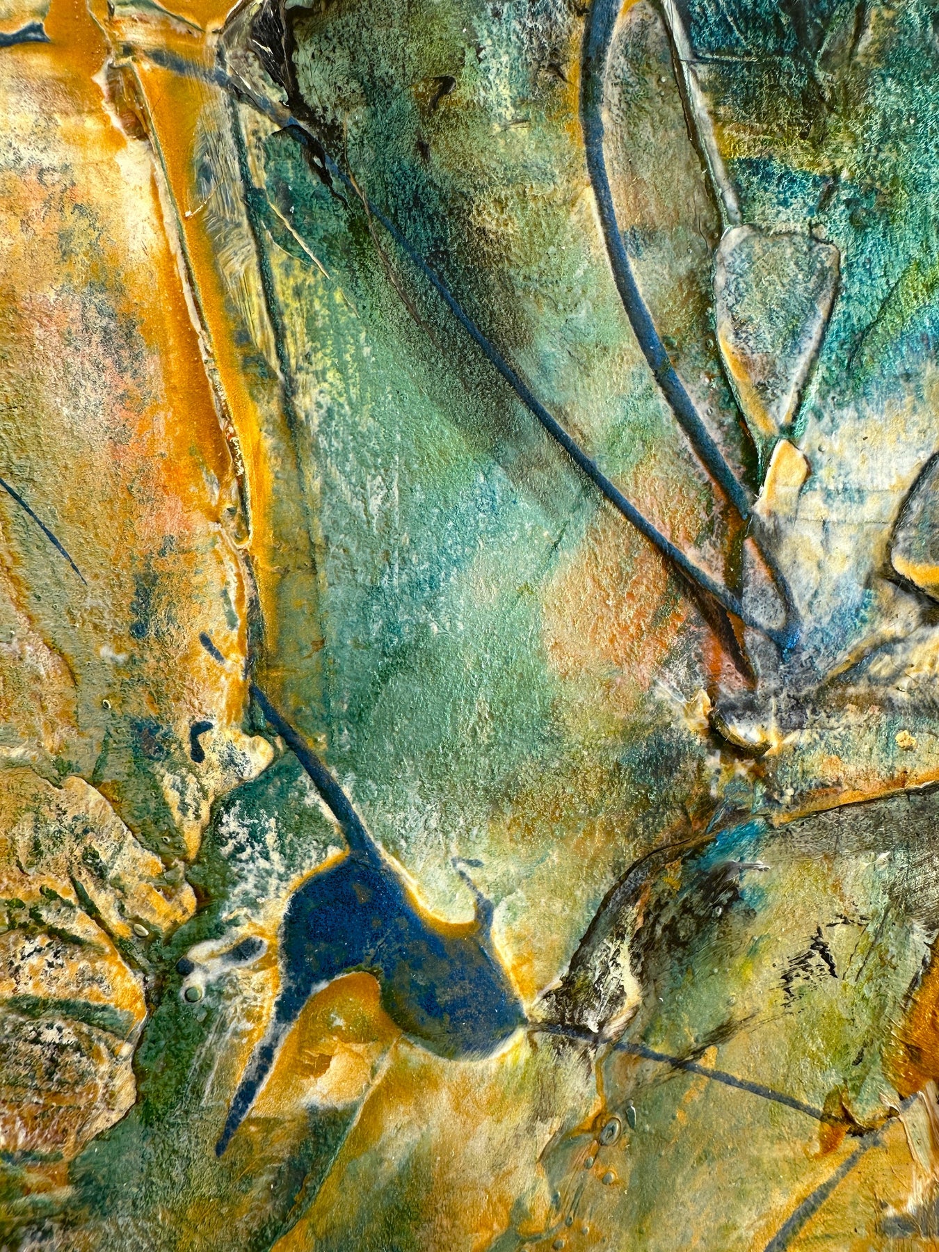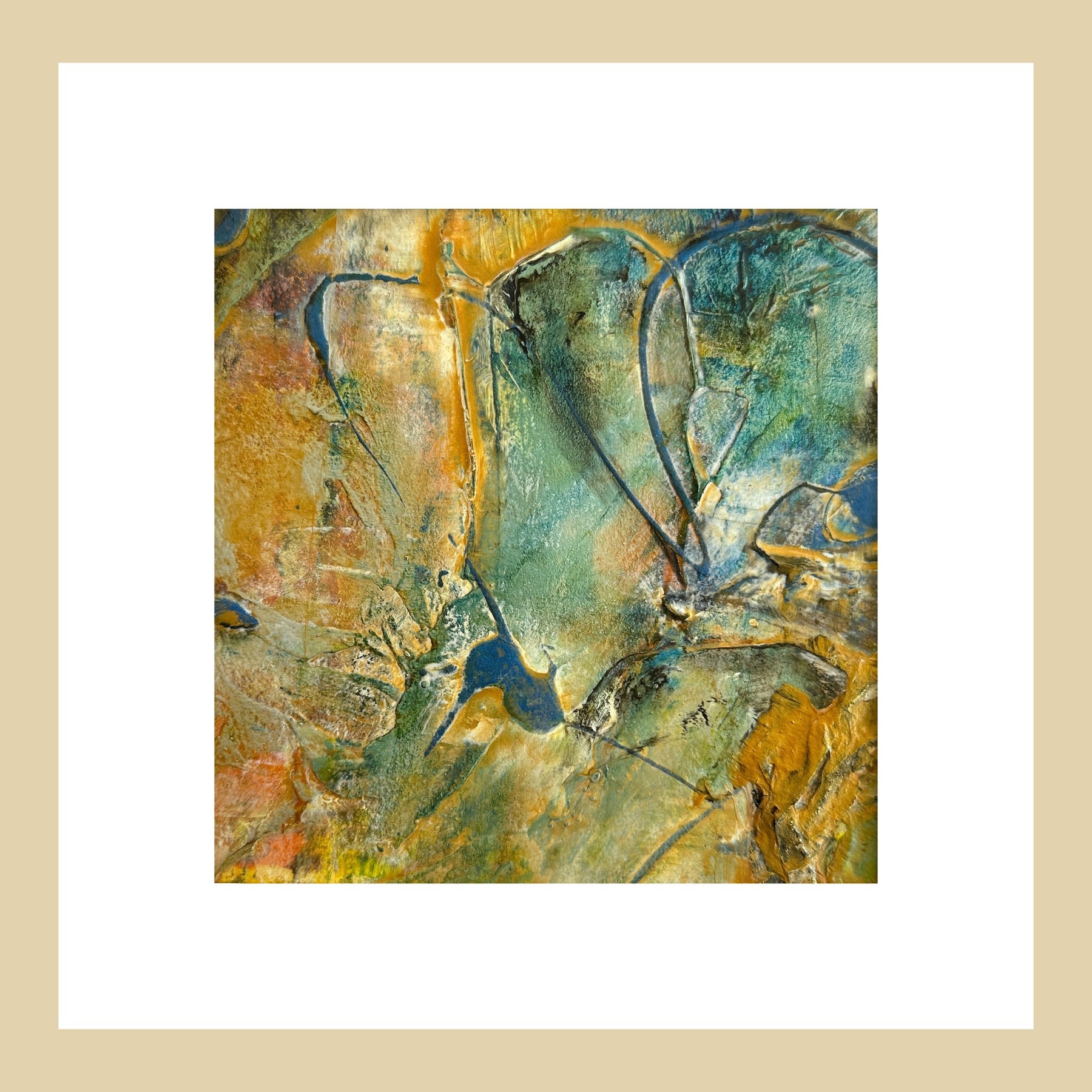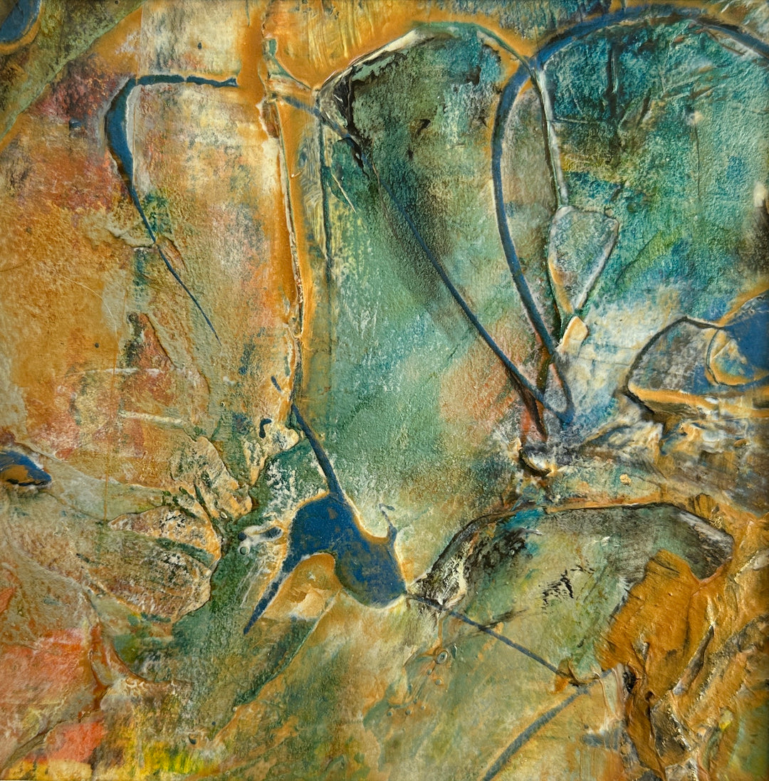 "Achieving Ataraxia" explores the pursuit of inner resilience and peace through color and texture. Using cold wax and oil paints, I create layered, intuitive compositions inspired by nature. Each color serves a purpose—earth tones ground us, blues and greens soothe, and deeper hues invite reflection.